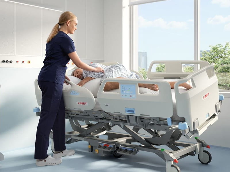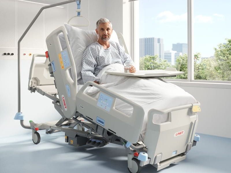Universeel ziekenhuisbed met een uitzonderlijk hoge toelaatbare belasting van 300 kg verbetert de veiligheid voor alle patiënten. Laterale kanteling wordt de nieuwe gouden standaard in de acute zorg